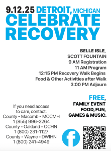 Join us for the 2025 Michigan Celebrate Recovery Walk & Rally at the beautiful Belle Isle Scott Fountain in Detroit! This FREE, family-friendly event is open to everyone in the community—whether you are in recovery, supporting a loved one, or simply standing in solidarity.