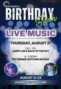 • 5:30 PM – 7:00 PMLarry Lee and Back in the Day headline the evening, delivering their signature throwback tunes to kick off the festivities. City of Warren+12City of Warren+12City of Warren+12